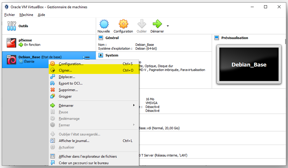 Un clic droit sur la VM réalisée à l’étape précédente offre l’option de clonage :